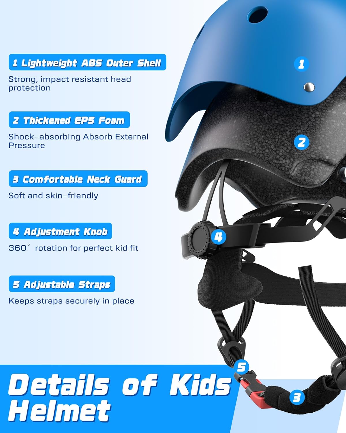- 【7 In 1 Protective Gear Set】Adjustment helmet knee pads and elbow pads set provide all-around safety for your kids, it is easy to carry includes a storage bag with 1 kids helmet, 2 knee pads, 2 elbow pads and 2 wrist guards.